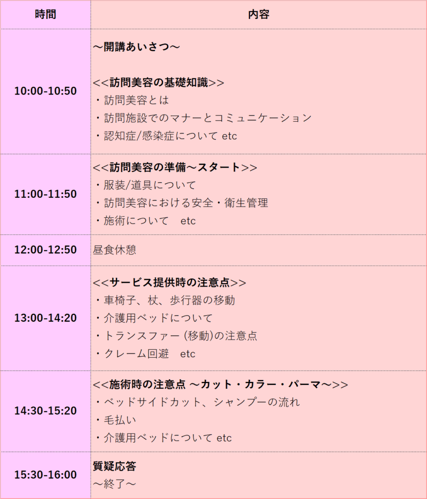 研修では道具の準備取扱い、感染症、高齢者・障がい・認知症の理解とサロン施術との違い、消毒、施術一連の流れ(お客様の移動、誘導、コミニケション、カウンセリング、カット・シェービング・シャンプー・カラー、パーマ、毛払い等)まで、訪問美容に必要な技術を理解します。